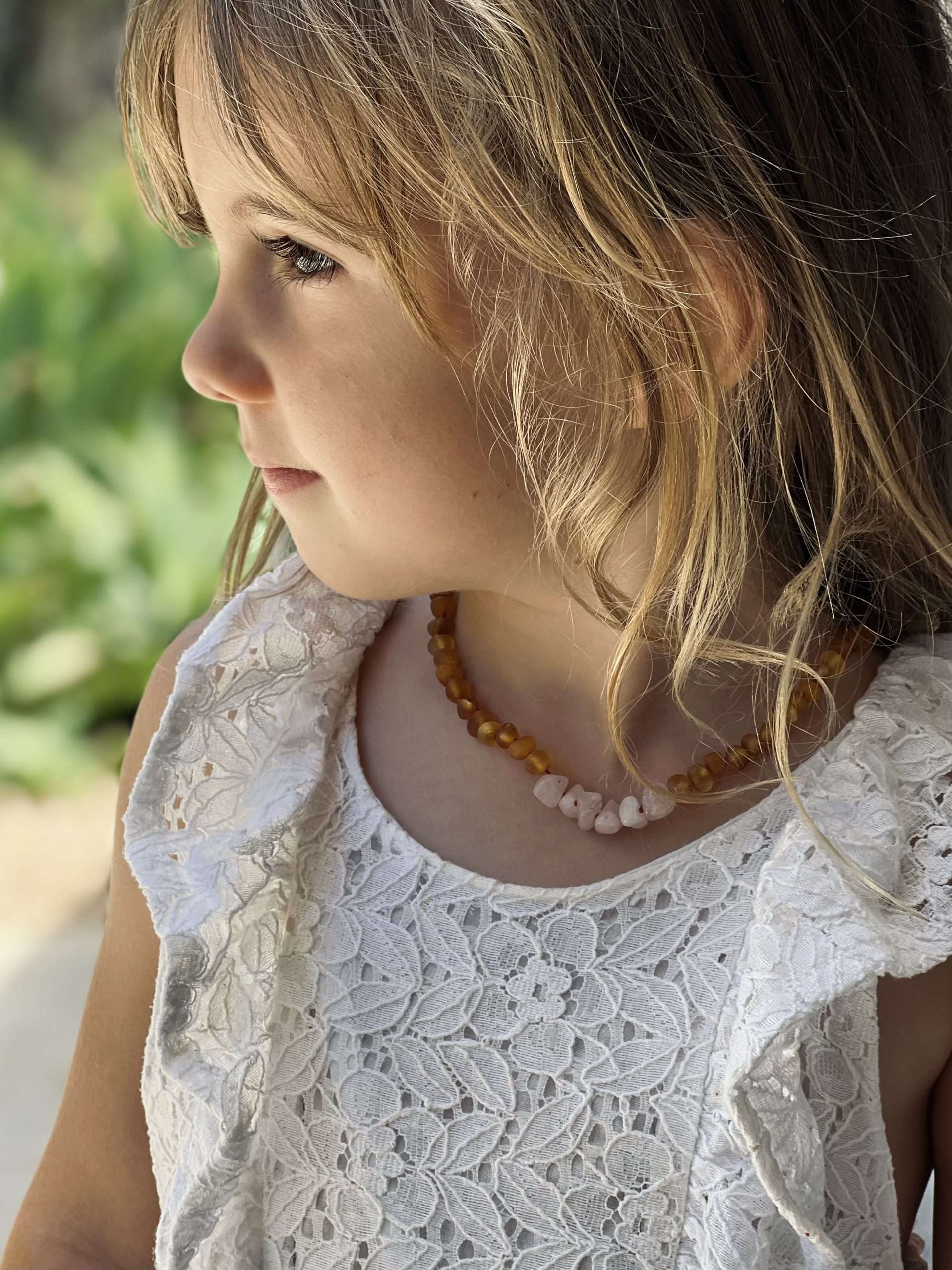 Amber jewellery is made for wearing not for chewing. Children should be supervised at all times when wearing jewellery, and it should be removed when child is sleeping or unattended.